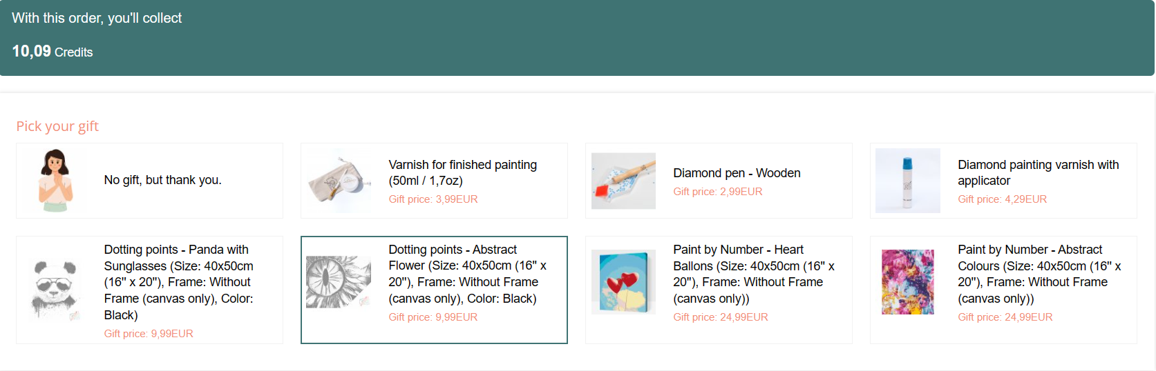 Aangezien de totale waarde van de bestelling hoger is dan normaal, kreeg de klant de mogelijkheid om een cadeau te kiezen uit een gevarieerd aanbod, zoals de Dot painting creatieve set, die ze misschien nog niet eerder hadden gebruikt.
