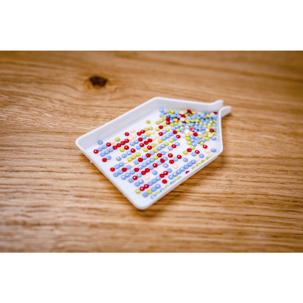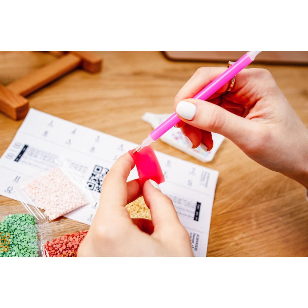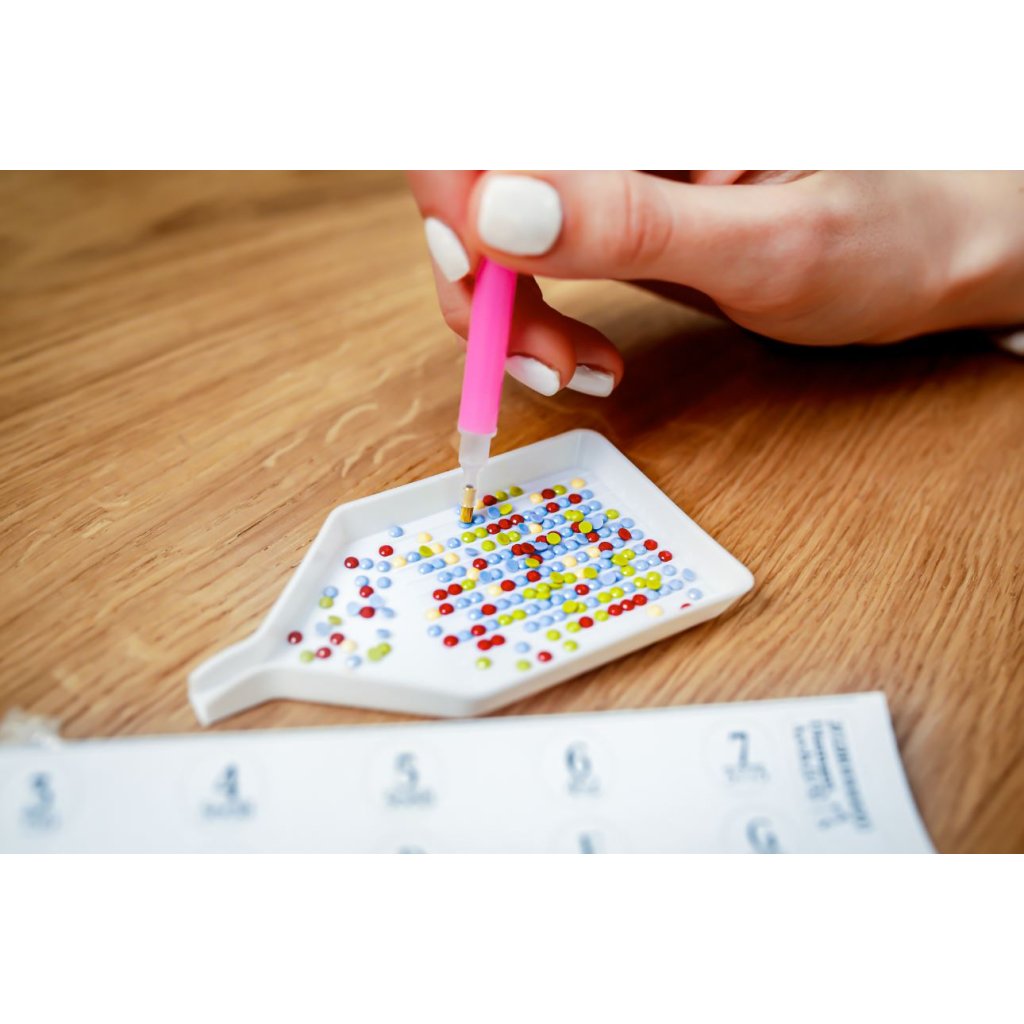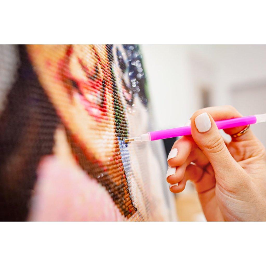 Het proces is eenvoudig: in uw kit zit een canvas met sjabloon en lijmlaag, waarop u gemarkeerde diamanten aanbrengt door ze te matchen met de bijbehorende symbolen op het canvas. De diamantpen is erg handig, omdat u er maximaal drie diamanten tegelijk mee kunt aanbrengen. En met de sticky tack, die lijkt op een schilderspalet, raakt u uw kostbare diamanten niet kwijt!
