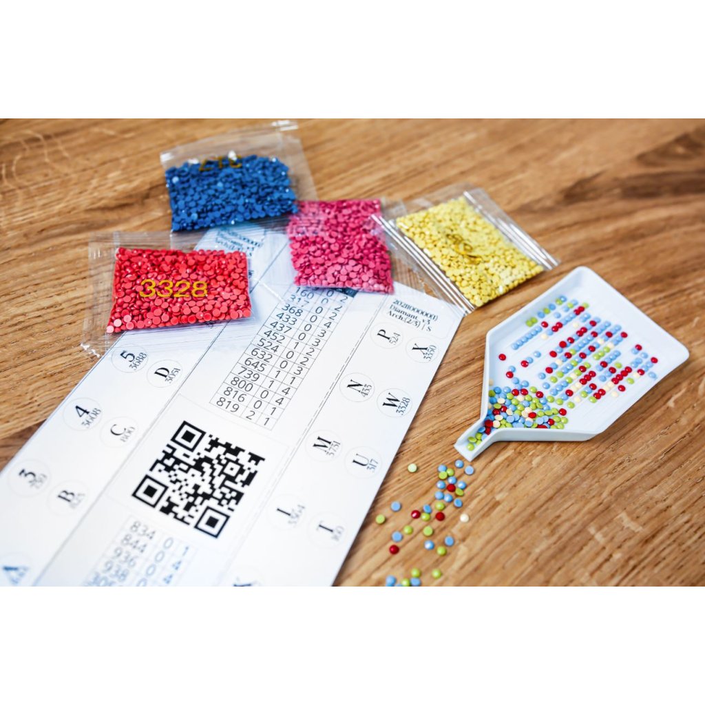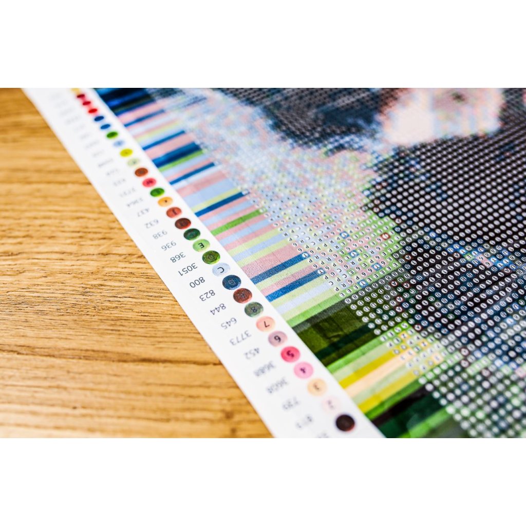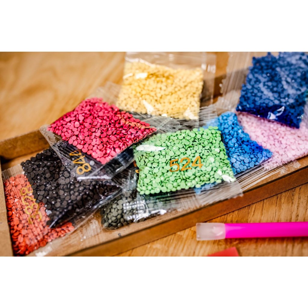Diamanten - Elk gelabeld pakje diamanten komt overeen met die op het canvas. De diamanten zijn ongeveer 2,8 mm groot - vrij klein - en een voltooid kunstwerk bevat honderden diamanten. Na al dat zorgvuldige werk heeft u een schitterend meesterwerk!