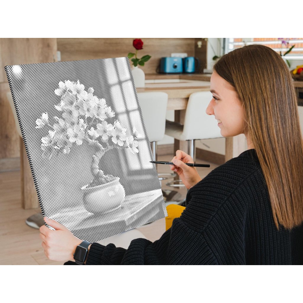 Maak je eigen nieuwe designschilderij met stippen! Kies een viltstift in je favoriete kleur en breng in je eigen tempo stippen aan op het voorbedrukte canvas. Als je kiest voor een versie met lijst, kun je het schilderij direct aan de muur hangen. Het resultaat is gegarandeerd een indrukwekkend kunstwerk, ook al heb je geen enkele schilderervaring. Stip voor stip creëer je een prachtig kunstwerk.