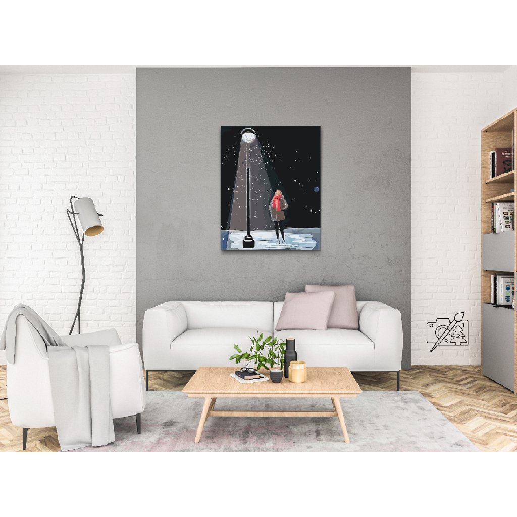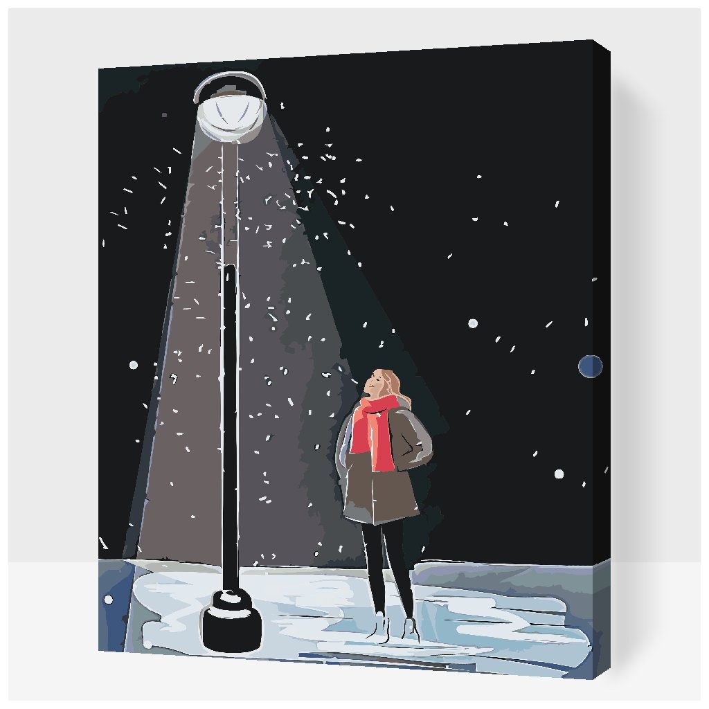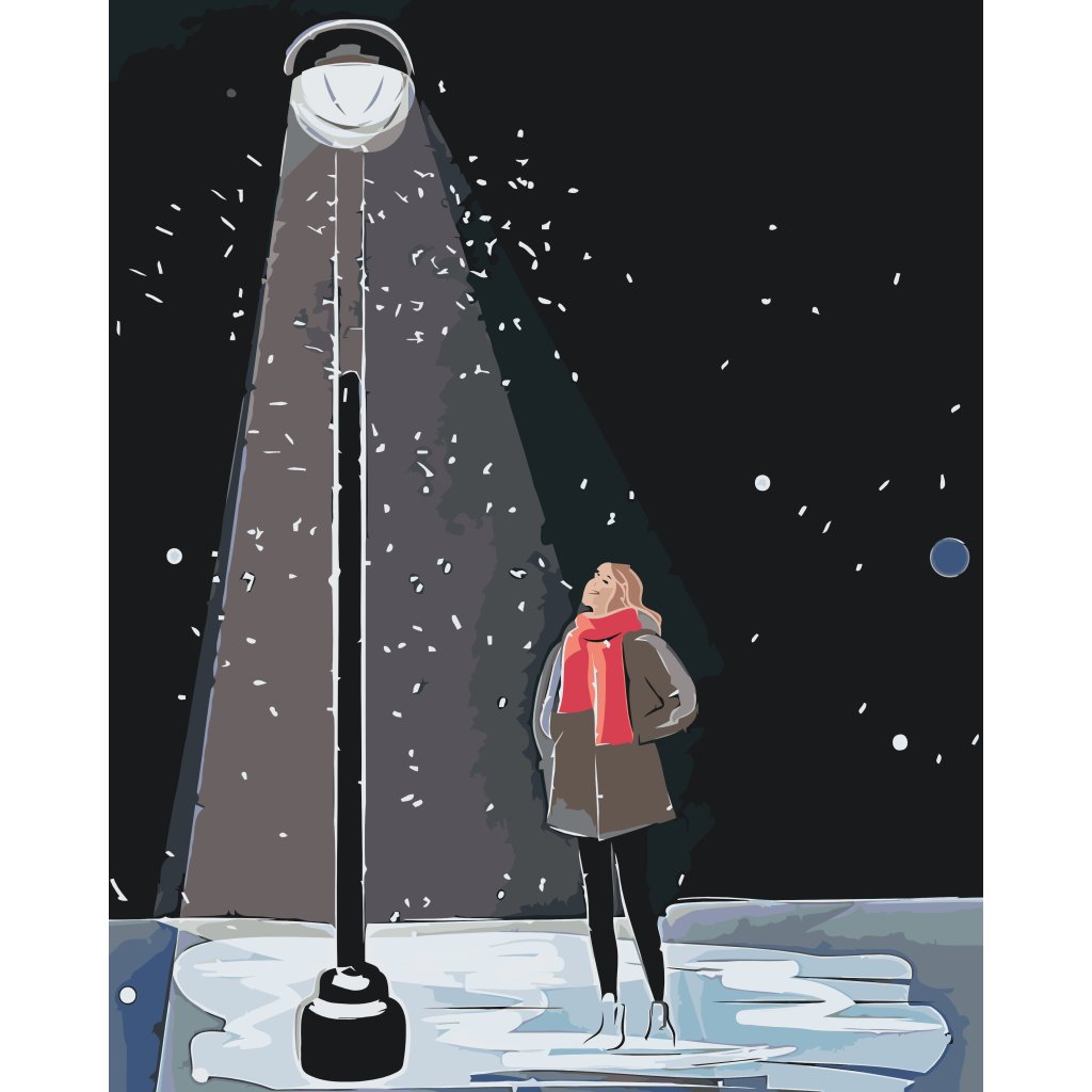 Schilderen op nummer - Vrouw onder een lamp en vallende sneeuw