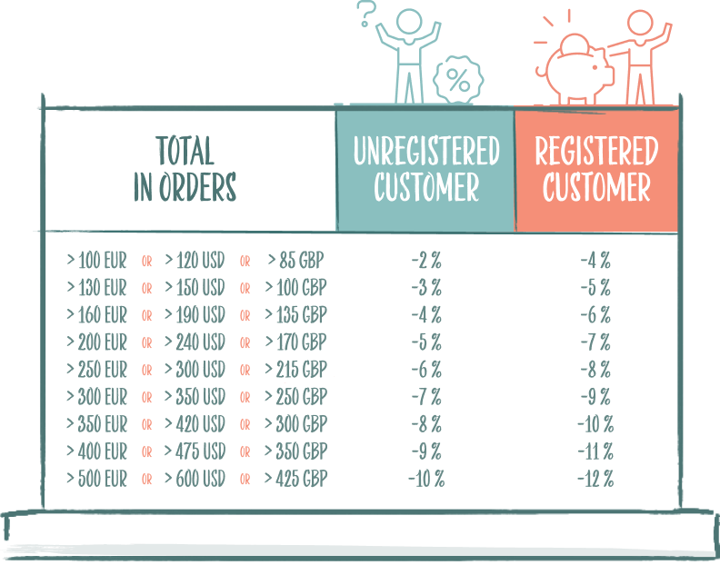 Huidig ingestelde staffelkortingen voor niet-geregistreerde en geregistreerde klanten.